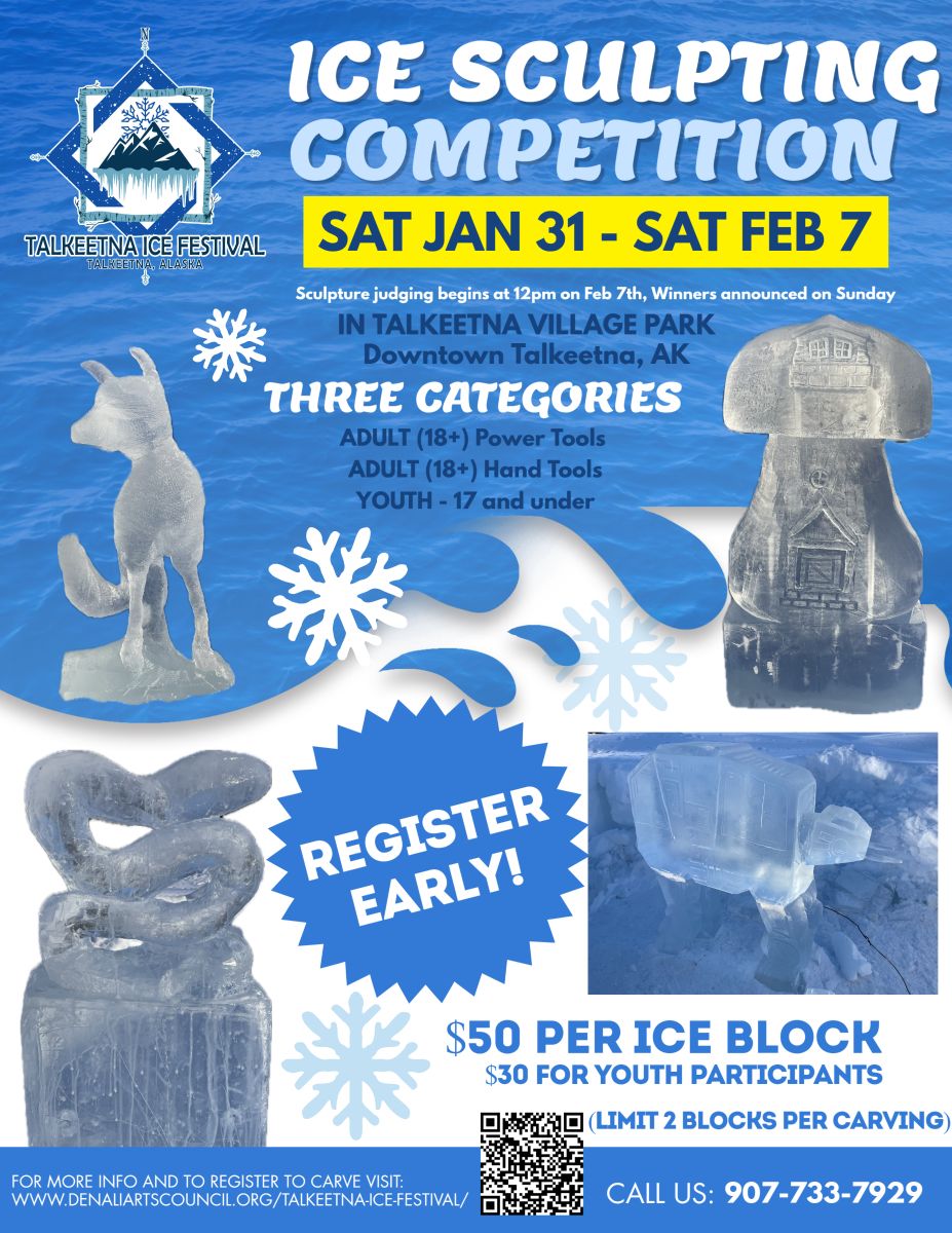 Join us for the 5th annual Ice Sculpting Competition as part of the Talkeetna Ice Festival. Participants will have 8 days to complete their carvings, which will remain on display in the Talkeetna Village Park until the weather says otherwise. Register here to be a participant!